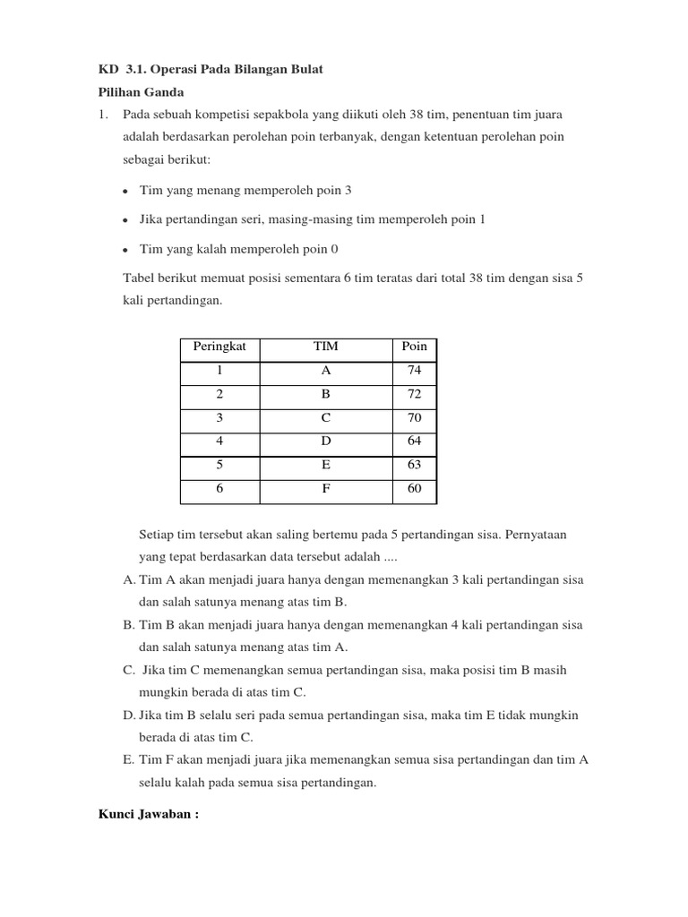 Soal dan kunci jawaban materi bilangan bulat berikut 7 soal materi bilangan bulat dilengkapi kunci jawabannya 1. Ruang belajar siswa kelas 1 contoh soal operasi bilangan bulat. Soal dan kunci jawaban materi bilangan bulat berikut 7 soal materi bilangan bulat dilengkapi kunci jawabannya 1. Contoh soal dan pembahasan bilangan bulat. Pembahasan bilangan bulat ini merupakan inti dari standar kompetensi sk melakukan operasi bilangan bulat dalam pemecahan. Contoh soal hots operasi hitung bilangan bulat. By ahmad ghaniposted on january 29, 2021. Download contoh soal pembahasan bilangan bulat pecahan smp dalam bentuk pdf klik disini soal no 2 jika. Contoh soal bilangan bulat sd pengertian. Pada sebuah kompetisi sepakbola yang diikuti oleh 38 tim, penentuan tim juara adalah berdasarkan perolehan poin terbanyak, dengan ketentuan perolehan poin sebagai berikut documents similar to 1. Sebagaimana yang kita ketahui, bahwa bilangan bulat itu terdiri dari tiga jenis anggota bilangan bulat, yakni yang pertama adalah bilangan bulat positif, yang kedua bilangan bulat. Semoga contoh soal yang admin bagikan ini dapat membantu anak didik dalam mencari contoh soal terbaru seputar pas matematika materi bilangan bulat. Contoh soal bilangan bulat sd ruang belajar siswa kelas 3.